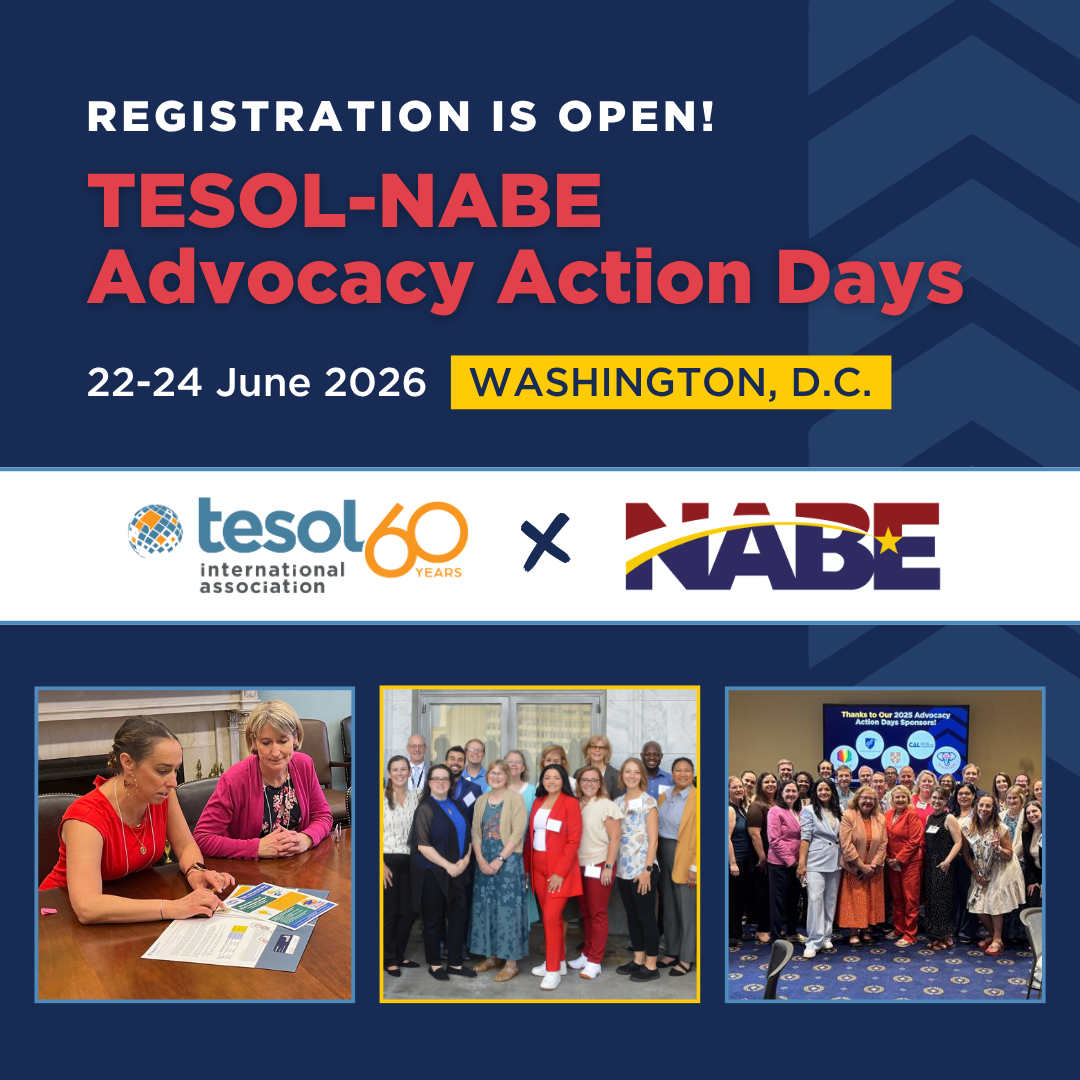 Join your fellow English language teaching colleagues to step up and speak out on the issues that impact you, your multilingual learners of English, and your communities. From 22 to 24 June 2026 at TESOL-NABE Advocacy Action Days in Washington, D.C., you’ll learn about current U.S. legislation that affects the English language teaching field, hone your advocacy skills, and take your voice to the Hill. Register by 8 June!
