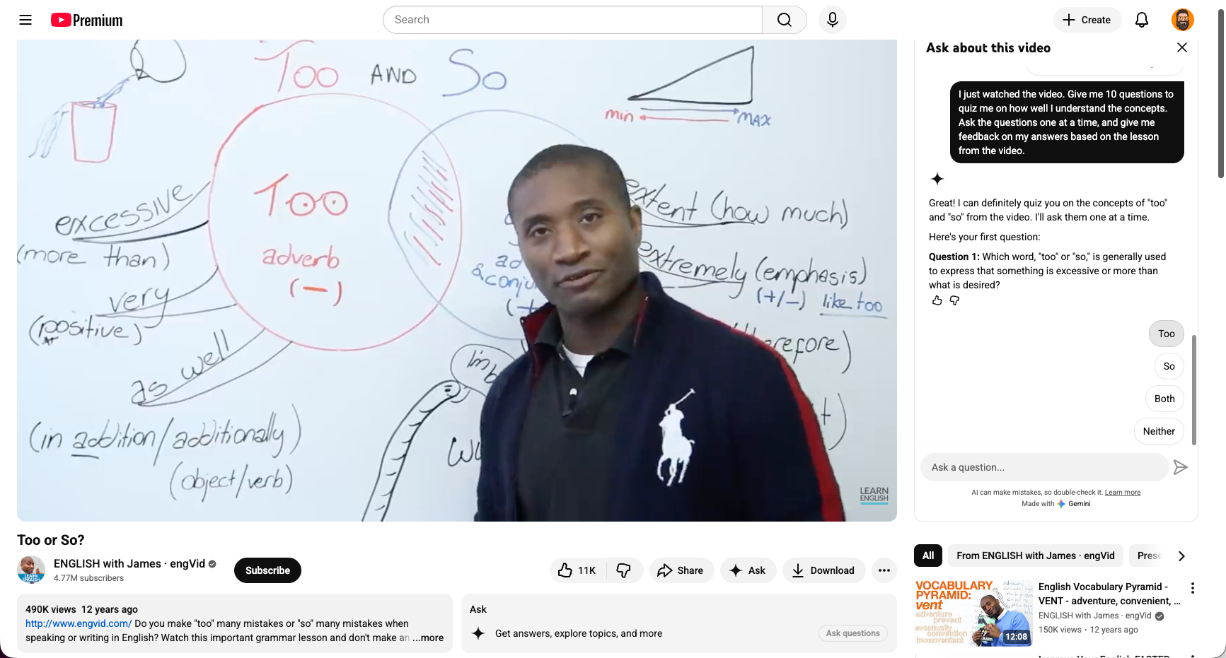 If students have a favorite YouTuber, like James from engVid in the screenshot above, they can turn any lecture into a practicing opportunity on the spot!