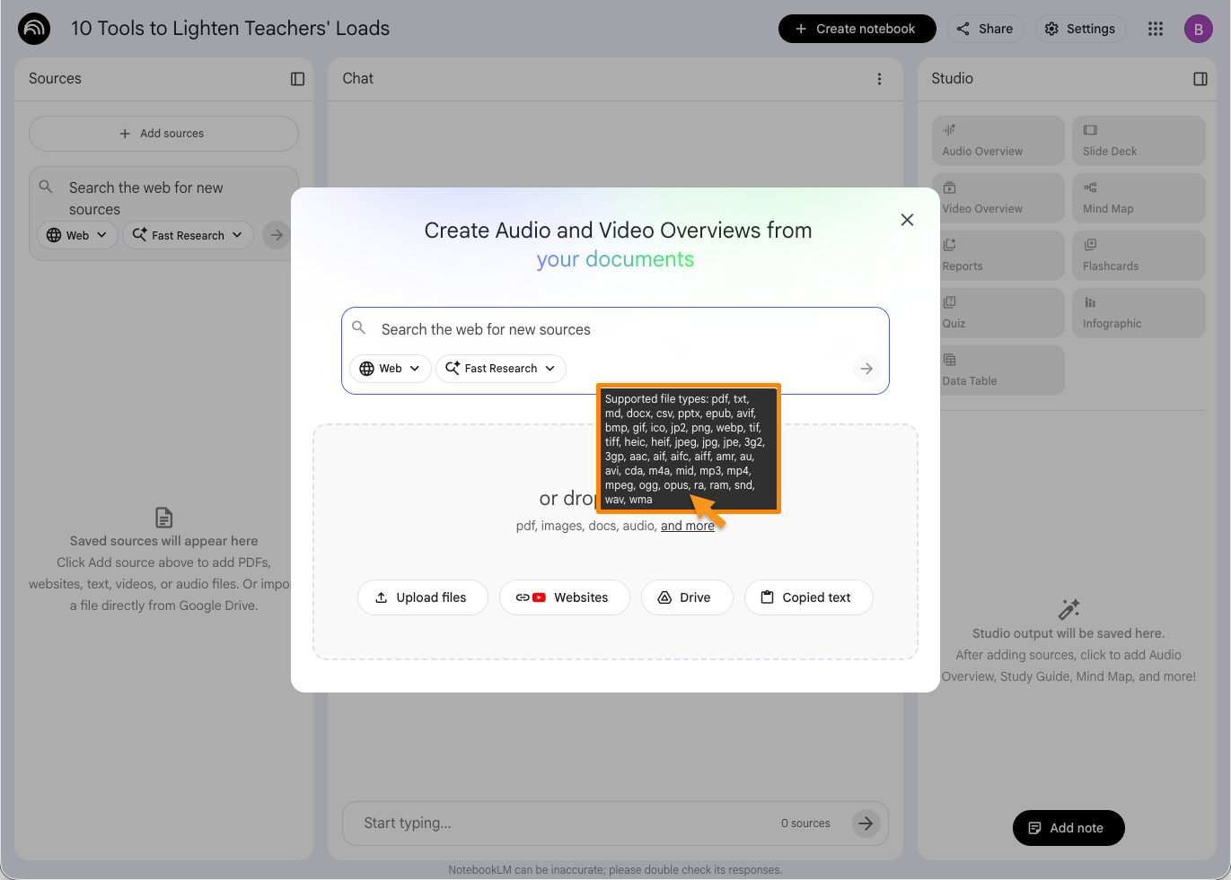 Most of us probably have preferred methods for taking notes. As mentioned above, you can do this however you like. If you take notes in Google Docs, you’re already on the smooth path to making sense of a session. If not, don’t worry—the joy of NotebookLM is that it works around your approach, and not the other way around. Whether you’re drawing sketchnotes, working with a bullet-journal, doing Cornell notes on scrap paper, or recording sections of the presentation (ask permission from the presenter, of course), all of your notes can be uploaded right into NotebookLM. It accepts most common file types, including PDFs, word processor documents, photos, video and audio files, and more. At most conventions, presenters are also encouraged to share their slide decks, so you can upload the PowerPoint, Google Slide, or PDF if it’s made available to go along with any of your own notes.