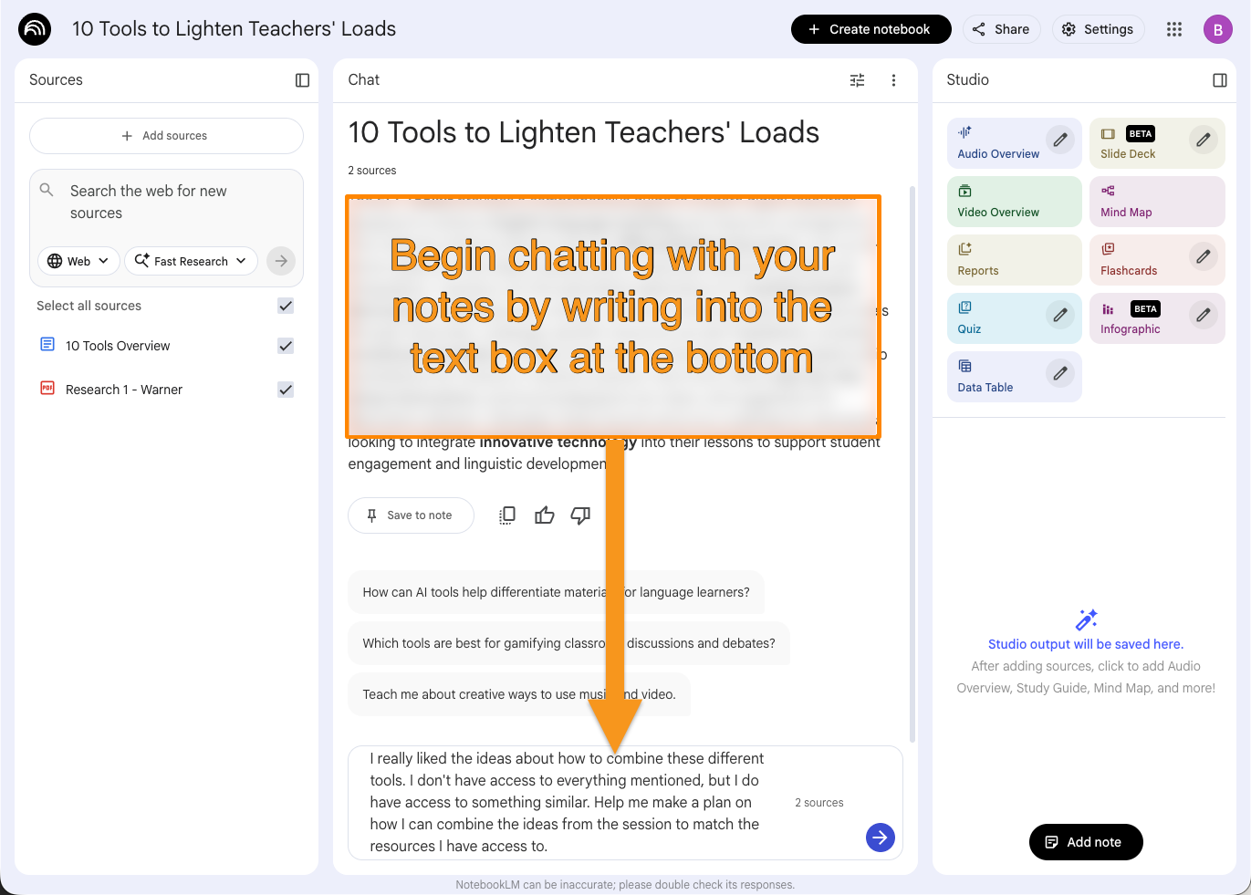So, imagine you attended my session on different tools to lighten your load, and then you attended a session on the value of storytelling. You could link those two notebooks together through Gemini to get ideas on how to use those tools in the context of classroom storytelling.
