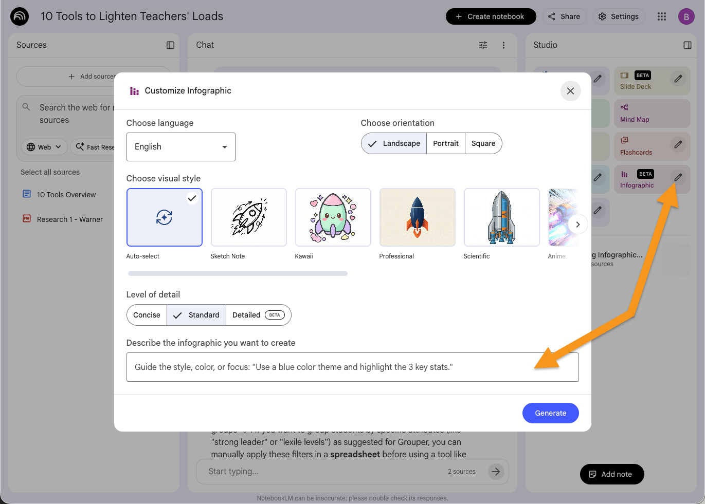 If you like learning through visuals, but you don’t love your drawings or simply don’t have time to draft out an infographic by yourself, this tool allows you to build out a customized infographic. Make sure to click on the pencil icon first so you can guide it to your intentions. You can choose things like your preferred language, visual style, level of detail, and even tell it what parts of the resources you want it to focus on.