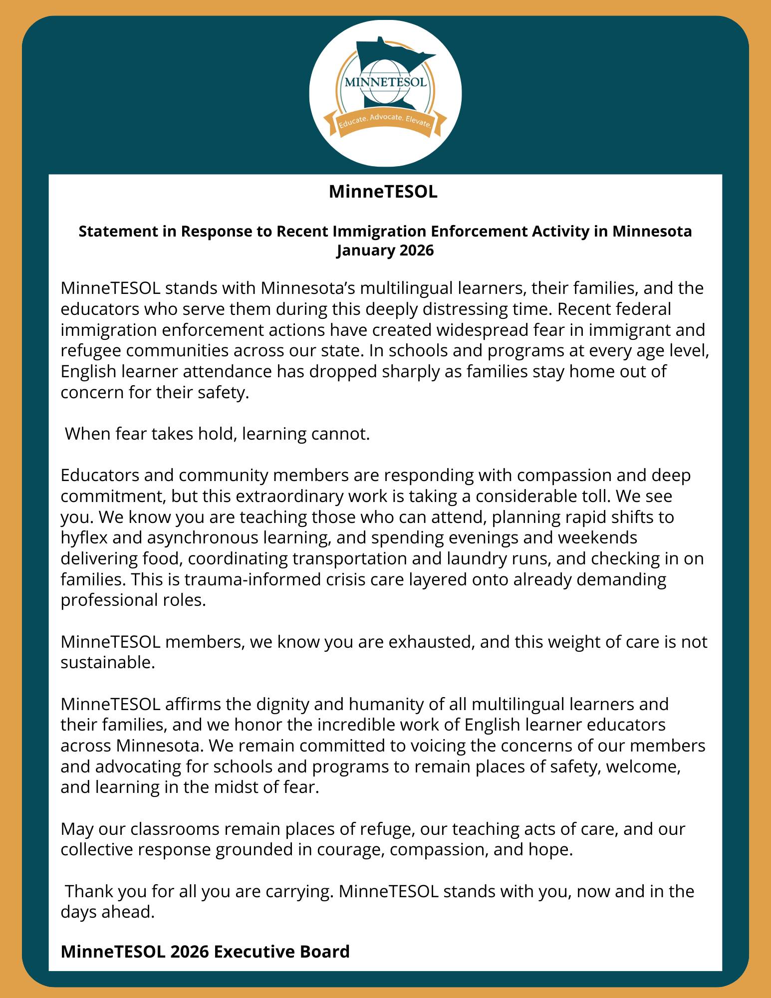 TESOL International Association applauds Minnesota TESOL (MinneTESOL) in its support of members, educators, learners, and communities impacted by the immigration activity in the state.