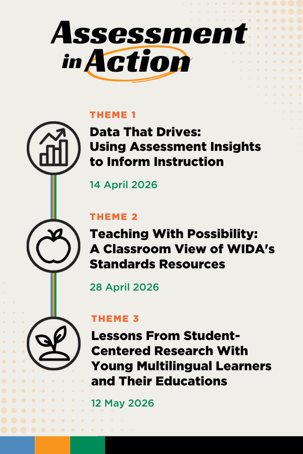 Timeline: Between April 2026 and May 2026, participants will attend three live webinars exploring assessment insights, classroom practices with WIDA standards resources, and student-centered research findings